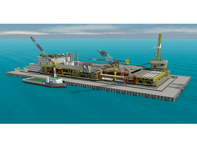 | Концепция – Коффердам Буровой, технологический, жилой, энергетический и вспомогательные модули размещены на искусственном острове. |